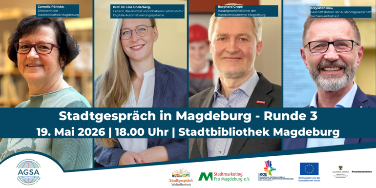 Die Auslandsgesellschaft Sachsen-Anhalt (AGSA) und der Stadtmarketingverein „Pro Magdeburg“ haben Anfang des Jahres 2026 mit dem „Stadtgespräch“ eine neue Veranstaltungsreihe ins Leben gerufen, die den öffentlichen Diskurs zum Thema Weltoffenheit in Magdeburg fördert.