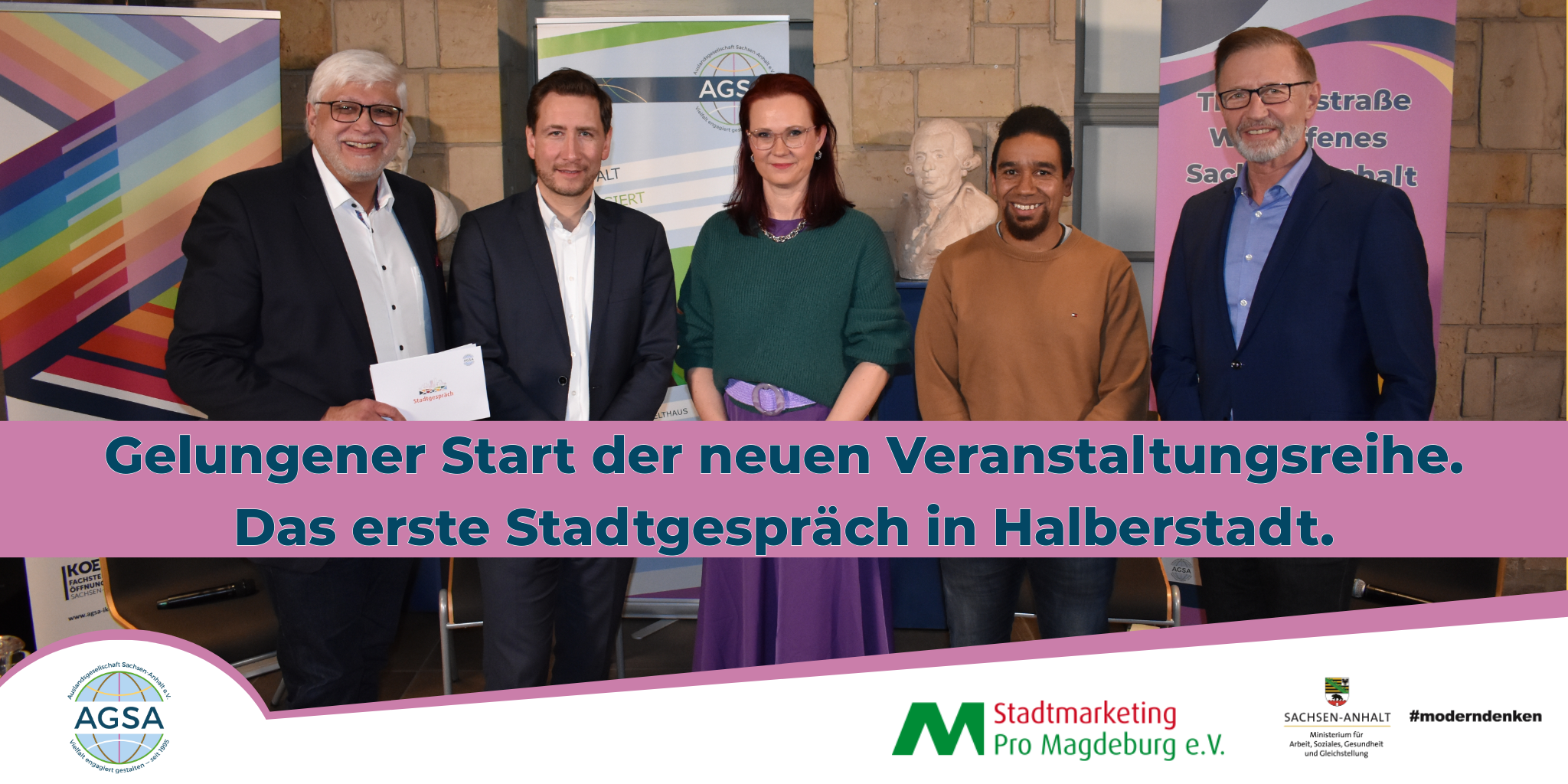 Mit dem Format „Stadtgespräch“ möchten AGSA und der Stadtmarketingverein den öffentlichen Diskurs zur Weltoffenheit in Sachsen-Anhalt stärken. Regelmäßig trifft sich dazu ein moderiertes „Quartett“ aus Vertreterinnen und Vertretern der AGSA, aus Kommunal- und Landespolitik sowie Persönlichkeiten aus Wirtschaft, Bildung und Kultur. Ziel ist es, Impulse für kommunales Handeln und gesellschaftliches Engagement zu setzen – im fachlichen Austausch ebenso wie durch persönliche Erfahrungen und gesellschaftspolitische Perspektiven. Die Teilnahme ist kostenfrei.