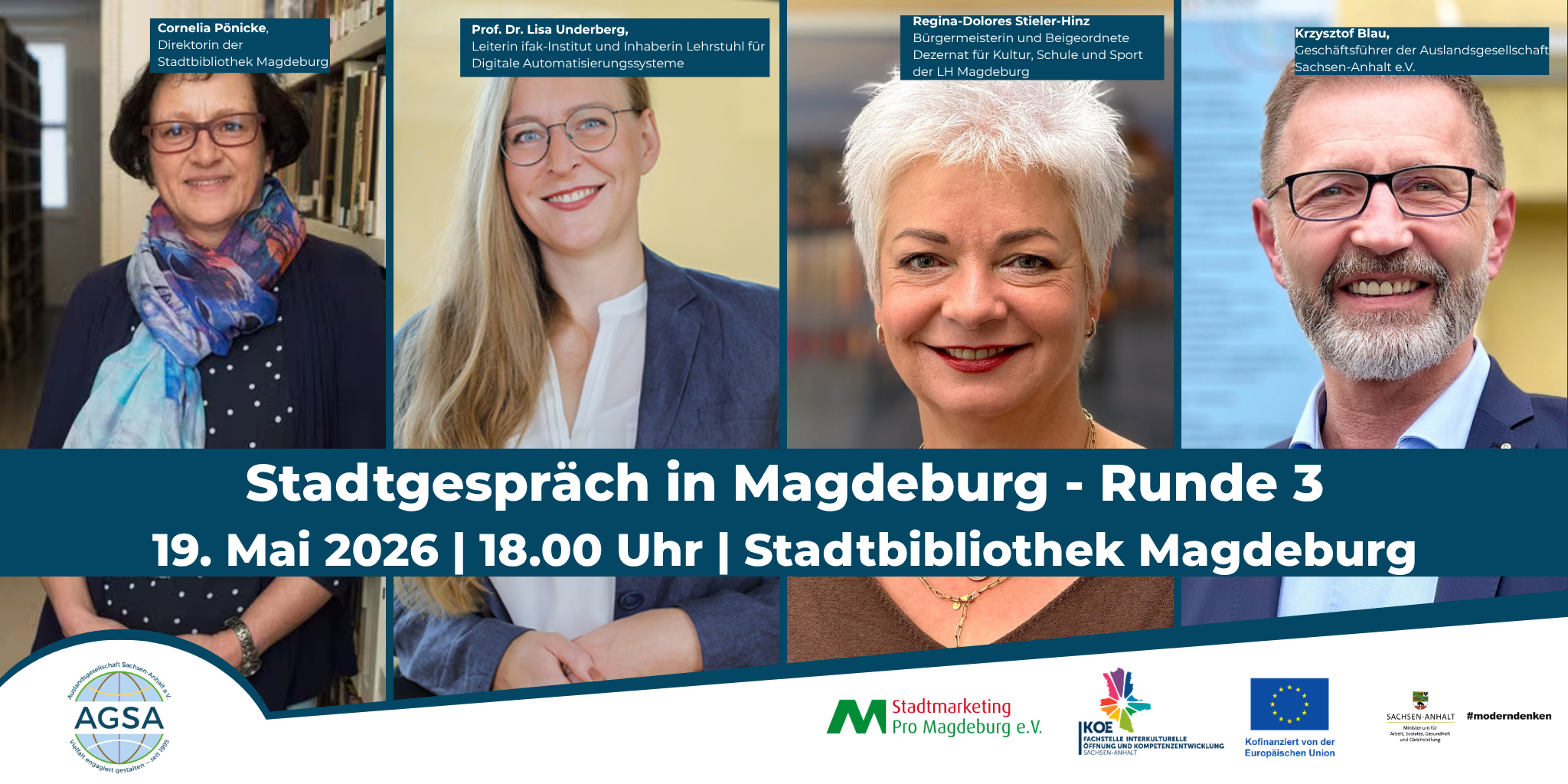 Die Auslandsgesellschaft Sachsen-Anhalt (AGSA) und der Stadtmarketingverein "Pro Magdeburg" e.V. veranstalten zum dritten Mal in Magdeburg das „Stadtgespräch“. Die Veranstaltungsreihe fördert den öffentlichen Diskurs zum Thema Weltoffenheit in Magdeburg.