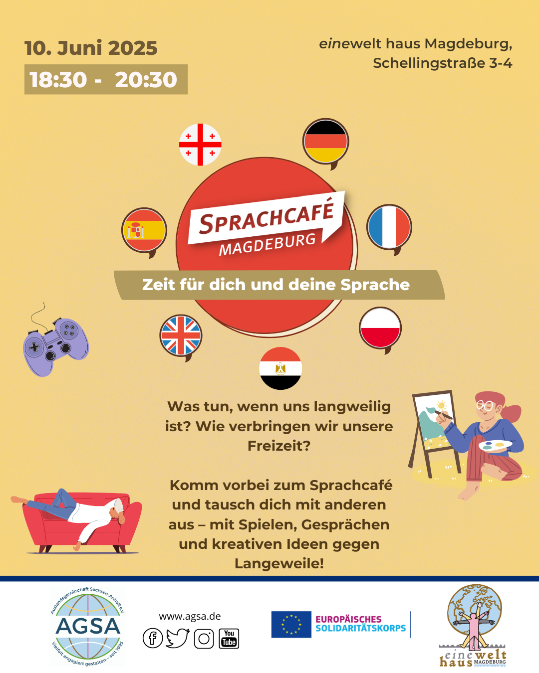 "Zeit für dich und deine Sprachen!" Unter diesem Motto veranstaltet die Auslandsgesellschaft Sachsen-Anhalt e. V. das Sprachcafé. Das Sprachcafé ist ein Sprachentreff für Muttersprachler, sowie für Sprachenlernende. Jeder kann kommen und in einer gemütlichen Atmosphäre seine Sprachen verbessern und neue Kontakte knüpfen. Es lohnt sich! Wir freuen uns über jeden Gast, denn mit euch füllt sich das Sprachcafé mit Leben! Organisiert wird der Treff von den Freiwilligen der Auslandsgesellschaft. Diese kommen sowohl aus Deutschland als auch aus anderen Ländern Europas. Die Sprachen dieser Länder können dann im Sprachcafé gesprochen werden.
