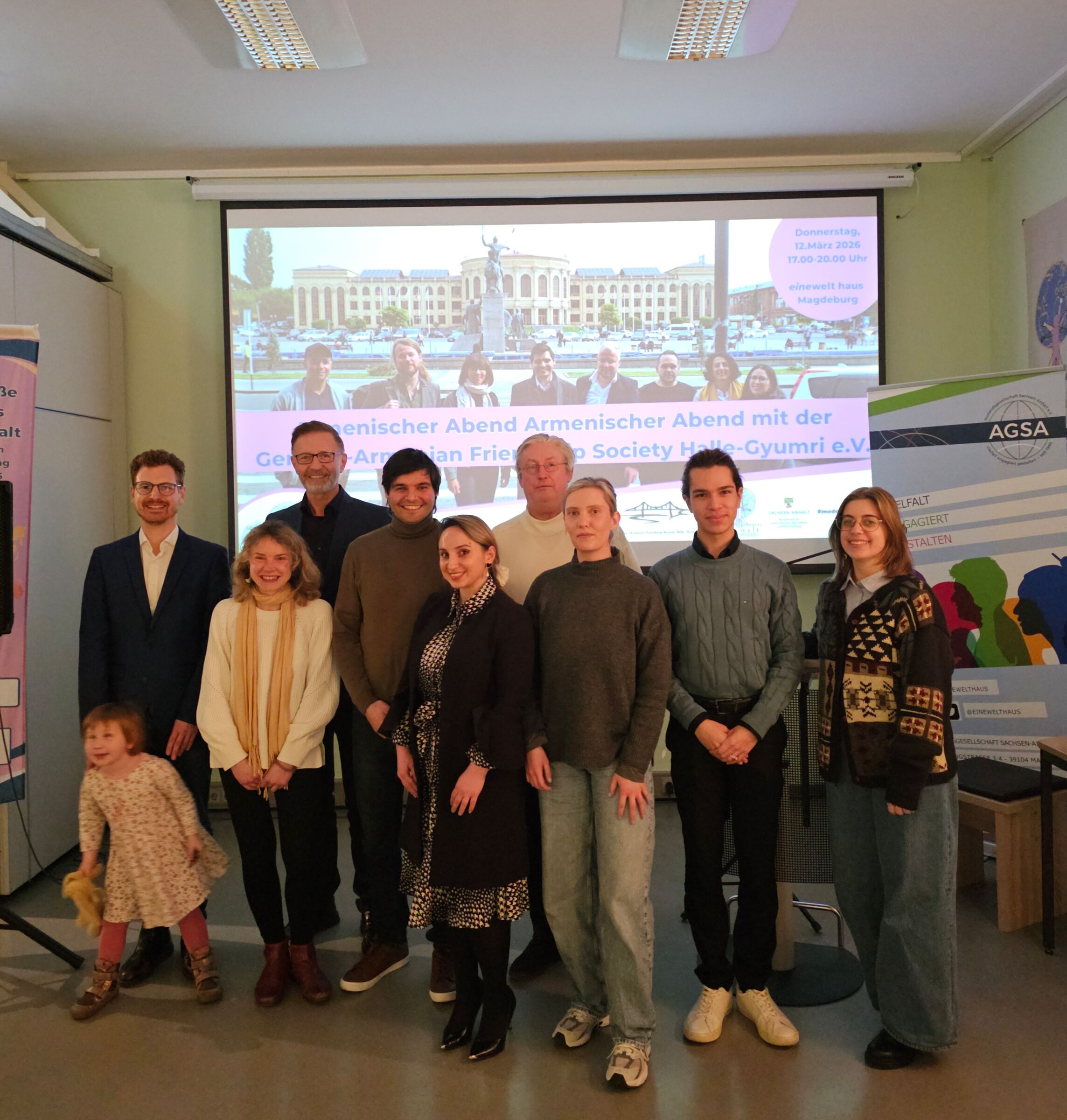 Am 12.03.2026 lud unsere Mitgliedsorganisation, der Städtepartnerschaftsverein Halle – Gyumri e.V., zu einem stimmungsvollen internationalen Abend ins einewelt haus Magdeburg ein. Bei traditionellem Merlenka-Kuchen, gefülltem Lavash und armenischem Wein gab der Vorsitzende Armen Klisch spannende Einblicke in die Vereinsarbeit.