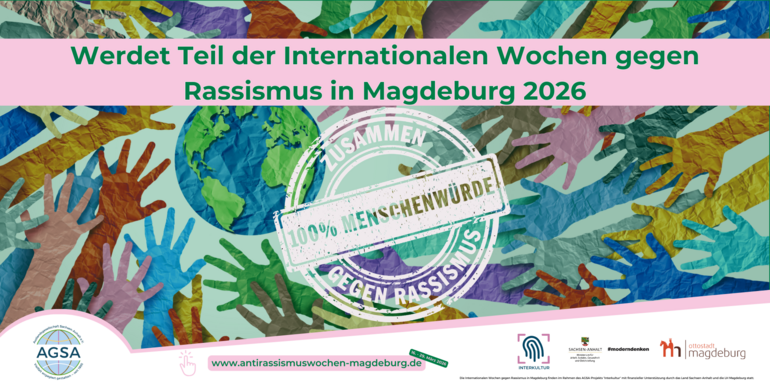 Auch 2026 koordiniert die AGSA die Internationale Wochen gegen Rassismus 2026 in Magdeburg und lädt dazu ein, gemeinsam ein starkes Zeichen für Menschenwürde, Solidarität und gesellschaftlichen Zusammenhalt zu setzen. Unter dem Motto „100 % Menschenwürde“ rufen wir dazu auf, sich mit eigenen Beiträgen zu beteiligen.