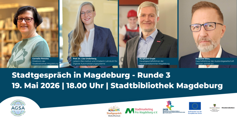 Die Auslandsgesellschaft Sachsen-Anhalt (AGSA) und der Stadtmarketingverein „Pro Magdeburg“ haben Anfang des Jahres 2026 mit dem „Stadtgespräch“ eine neue Veranstaltungsreihe ins Leben gerufen, die den öffentlichen Diskurs zum Thema Weltoffenheit in Magdeburg fördert.