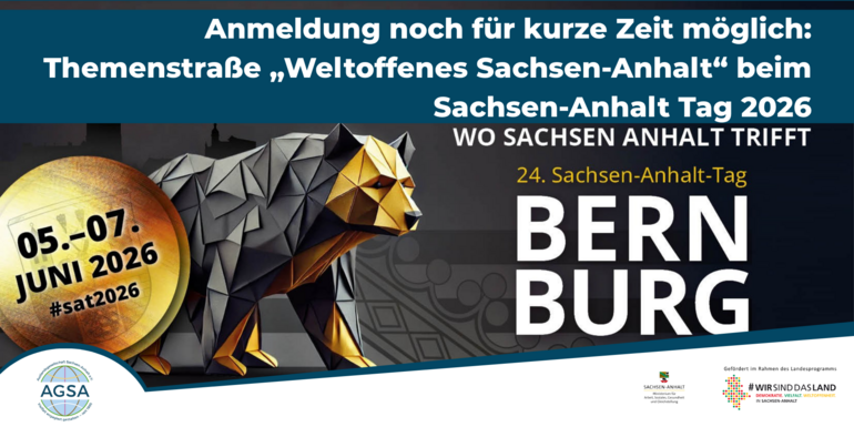 Als Auslandsgesellschaft Sachsen-Anhalt e.V. koordinieren wir die zivilgesellschaftliche Themenstraße „Weltoffenes Sachsen-Anhalt“ und laden alle interessierten Organisationen, Initiativen und Gruppen herzlich ein, sich zu beteiligen.