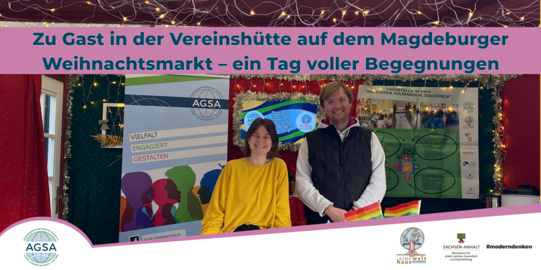 Am 11. Dezember 2025 war die AGSA zu Gast in der Vereinshütte auf dem Magdeburger Weihnachtsmarkt. In festlicher Atmosphäre konnten wir unsere Arbeit sowie das einewelt haus vorstellen und mit zahlreichen Besucherinnen und Besuchern ins Gespräch kommen.