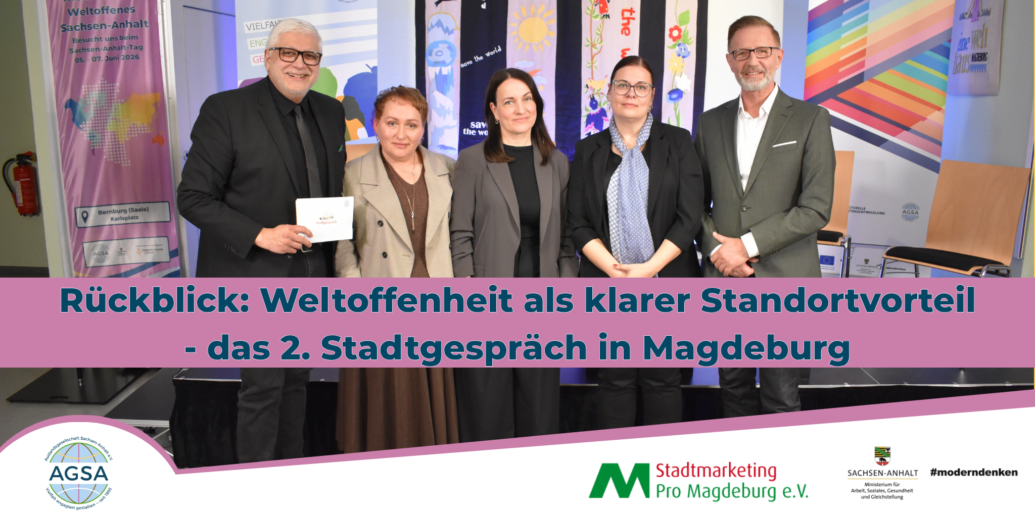 Am 19. März 2026 luden die Auslandsgesellschaft Sachsen-Anhalt e.V. (AGSA) und der Stadtmarketing „Pro Magdeburg“ e.V. zur 2. Magdeburg-Ausgabe der Dialogreihe "Stadtgespräch" ins einewelt haus Magdeburg ein. Moderator und Stadtmanager Georg Bandarau führte durch einen Abend voller Impulse aus Wirtschaft, Wissenschaft und Zivilgesellschaft, der eines klärte: Weltoffenheit ist für Magdeburg kein „Nice-to-have“, sondern ein knallharter Standortvorteil.