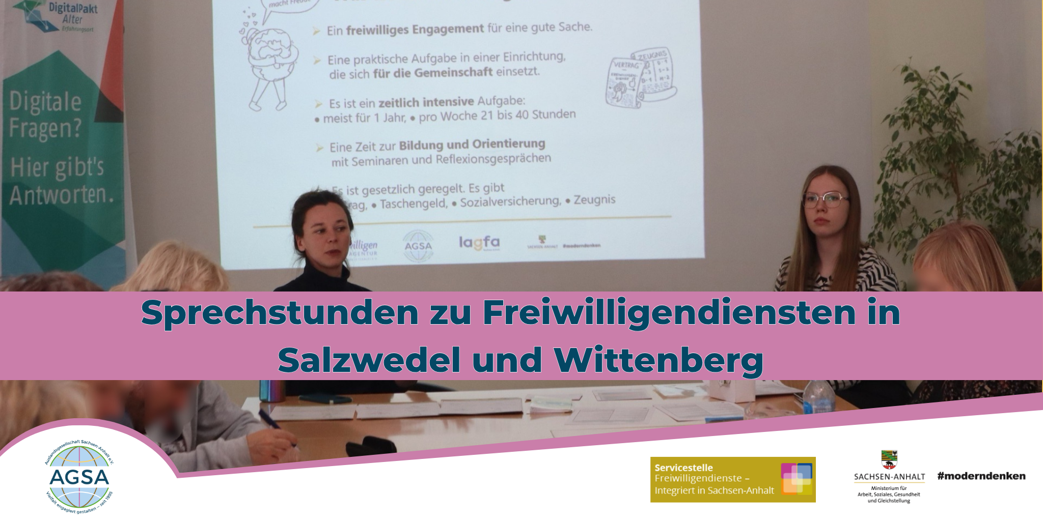 Im März und April 2026 fanden in Salzwedel und Wittenberg zwei Sprechstunden zum Thema Freiwilligendienste statt. Organisiert wurden sie von der Servicestelle „Freiwilligendienste – Integriert in Sachsen-Anhalt“ der Freiwilligen-Agentur Halle in Zusammenarbeit mit der Auslandsgesellschaft Sachsen-Anhalt e. V. (AGSA).