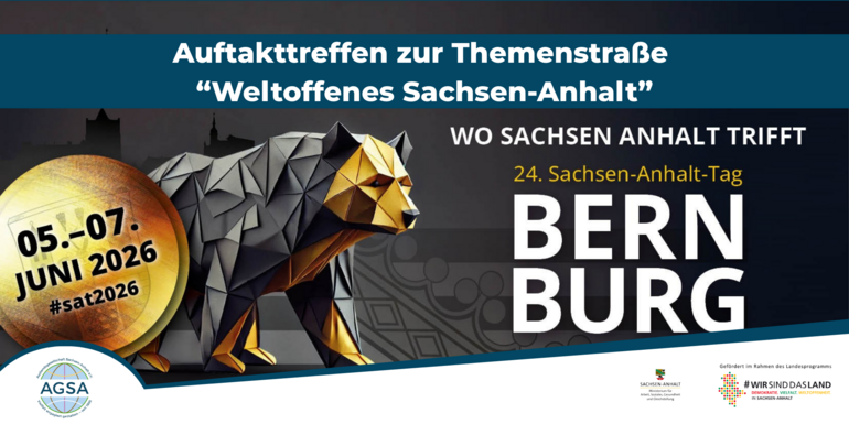 Die AGSA übernimmt die Koordination der Themenstraße „Weltoffenes Sachsen-Anhalt“. Das Landesfest findet vom 5. bis 7. Juni 2026 in Bernburg (Saale) statt. Zur Vorbereitung der Ausgestaltung der Themenstraße laden wir Sie herzlich zum Auftakttreffen ein.